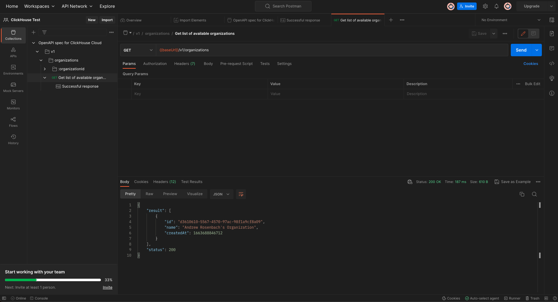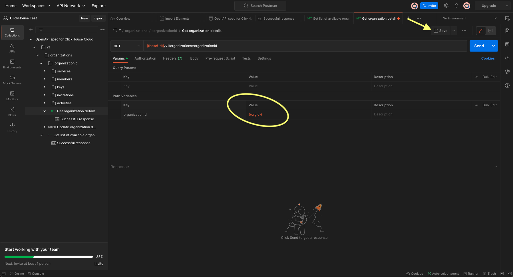 - В разделе "Спецификация OpenAPI для ClickHouse Cloud" разверните папку > V1 > organizations