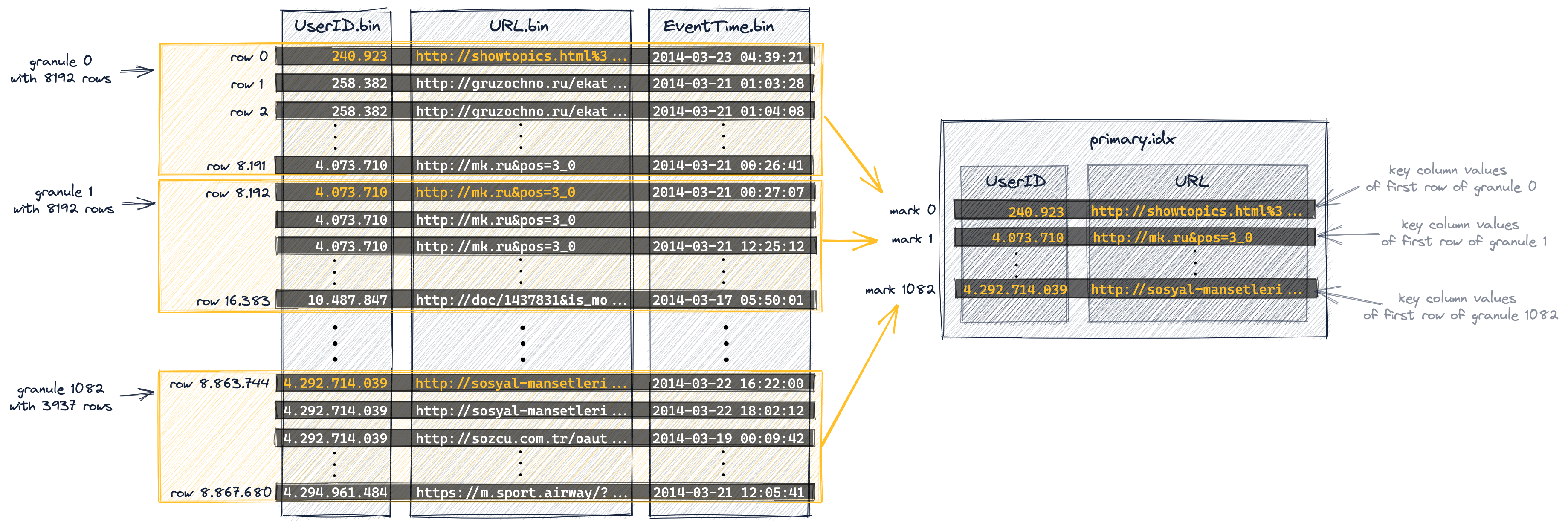 Диаграмма ниже показывает, что индекс хранит значения столбца первичного ключа (значения, отмеченные оранжевым на диаграмме выше) для каждой первой строки каждой гранулы. Или, другими словами: первичный индекс хранит значения столбца первичного ключа из каждой 8192-ой строки таблицы (в зависимости от физического порядка строк, определенного столбцами первичного ключа). Например: