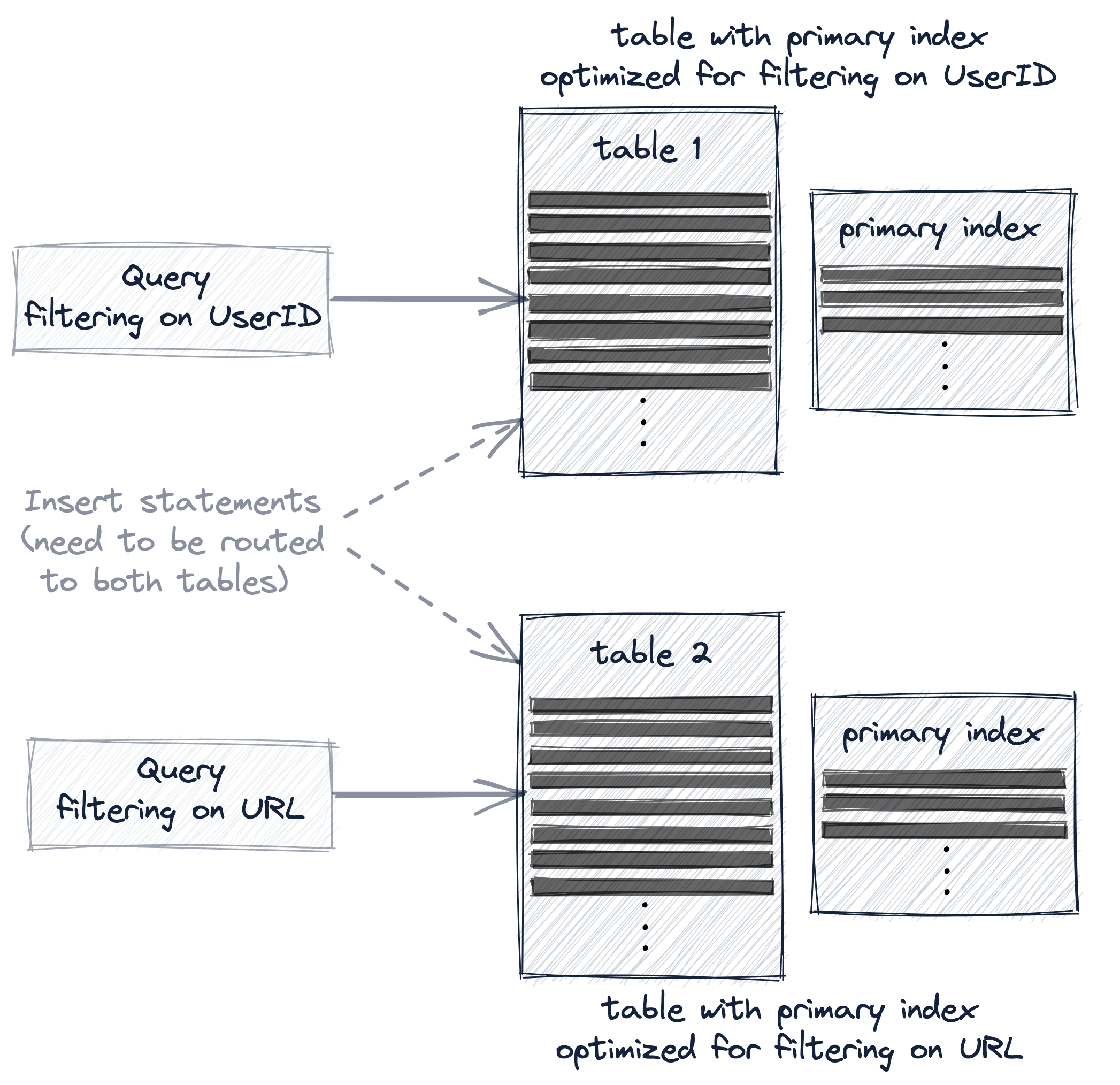 И наоборот: Первичный индекс нашей таблицы с составным первичным ключом (URL, UserID) ускорял запрос, фильтрующий по URL, но не предоставлял много поддержки запросу, фильтрующему по UserID.