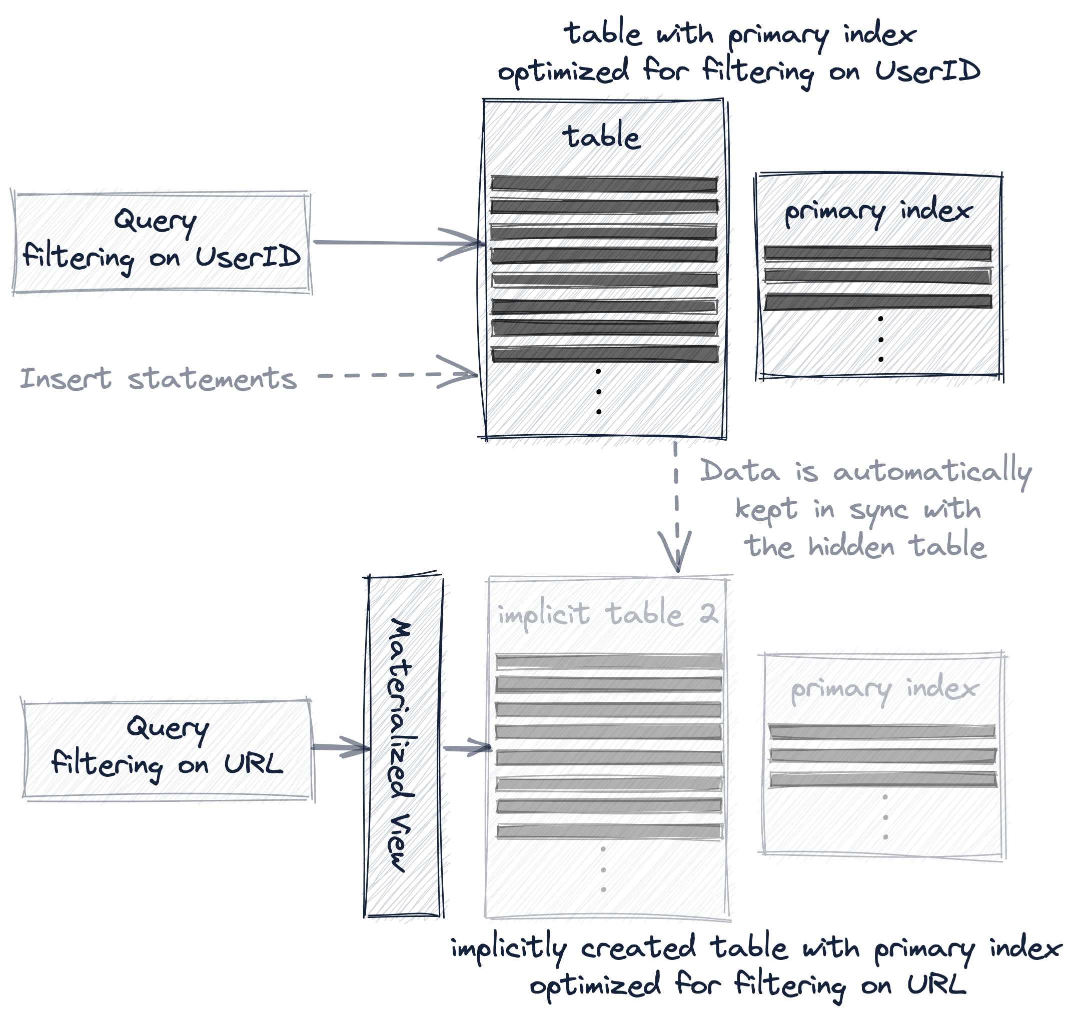 MATERIALIZE, чтобы немедленно заполнить скрытую таблицу всеми 8.87 миллионами строк из исходной таблицы hits_UserID_URL - если в исходную таблицу hits_UserID_URL вставляются новые строки, то эти строки также автоматически вставляются в скрытую таблицу