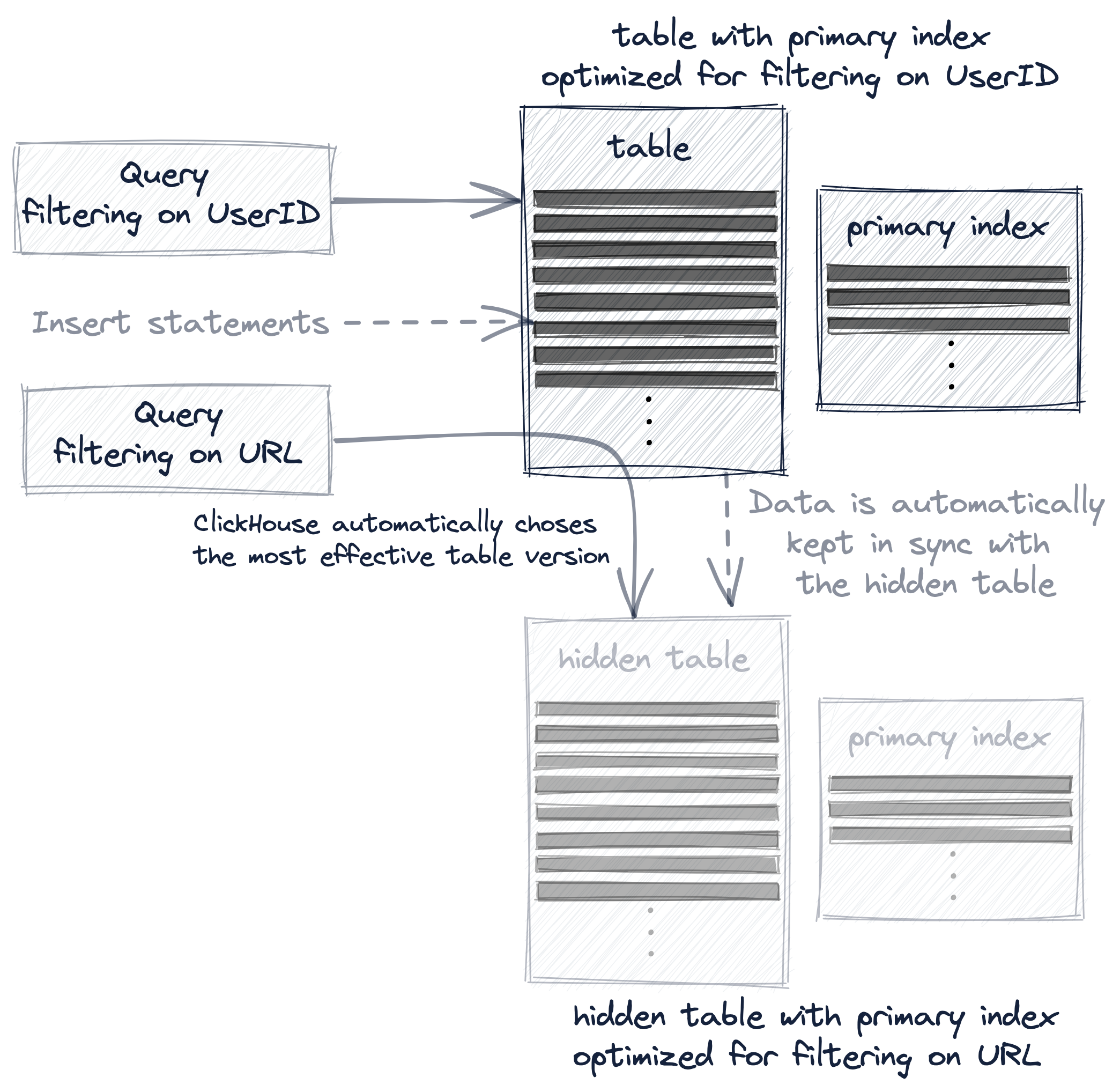 - запрос всегда (синтаксически) нацеливается на исходную таблицу hits_UserID_URL, но если порядок строк и первичный индекс скрытой таблицы позволяют более эффективное выполнение запроса, то будет использована эта скрытая таблица