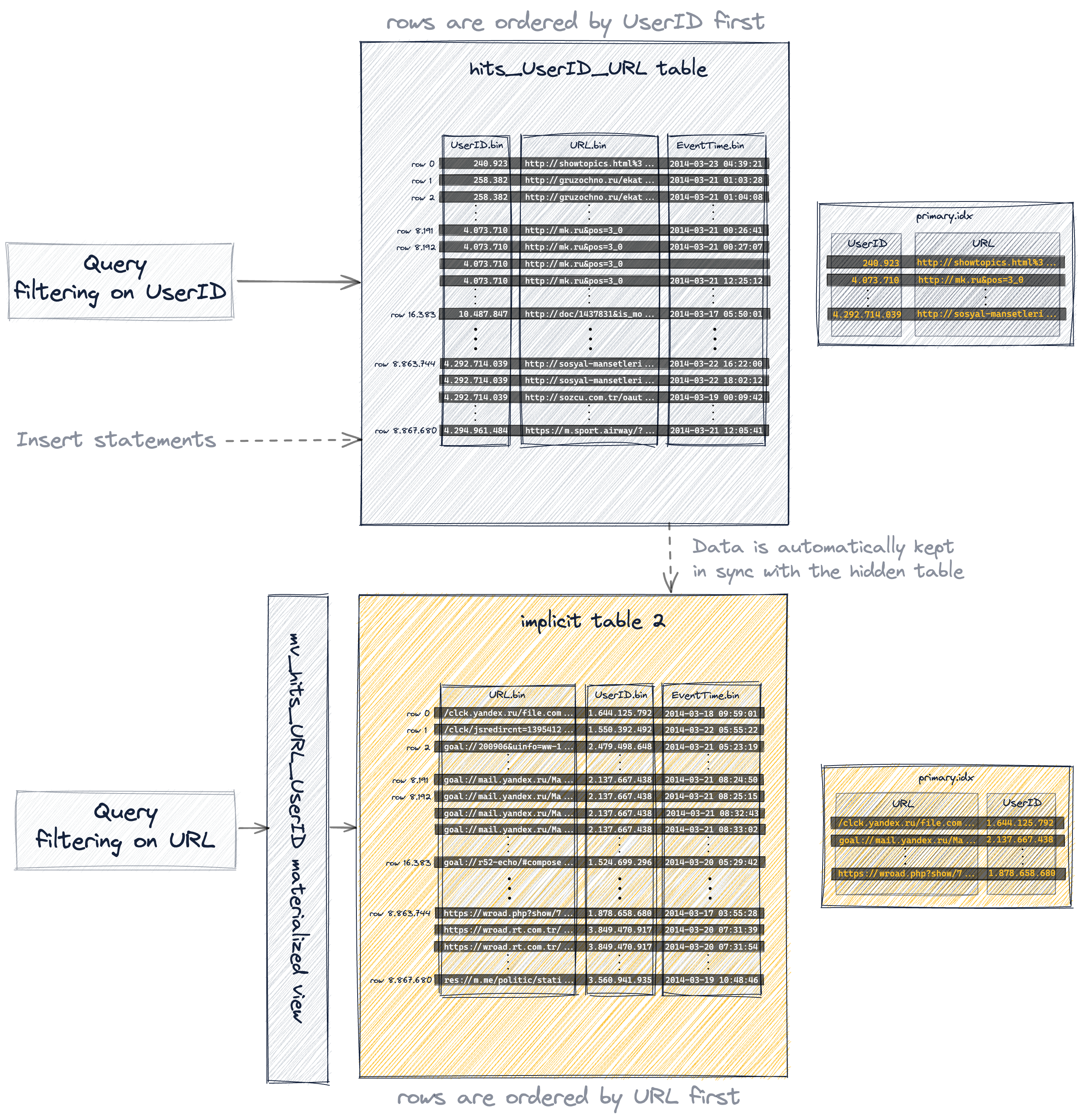 hits_URL_UserID_IsRobotс составным первичным ключом(URL, UserID, IsRobot), где мы упорядочиваем ключевые колонки по кардинальности в порядке убывания - таблицу