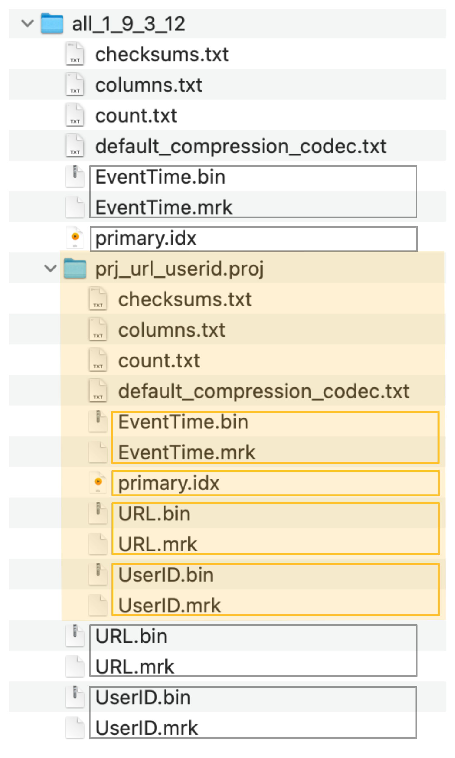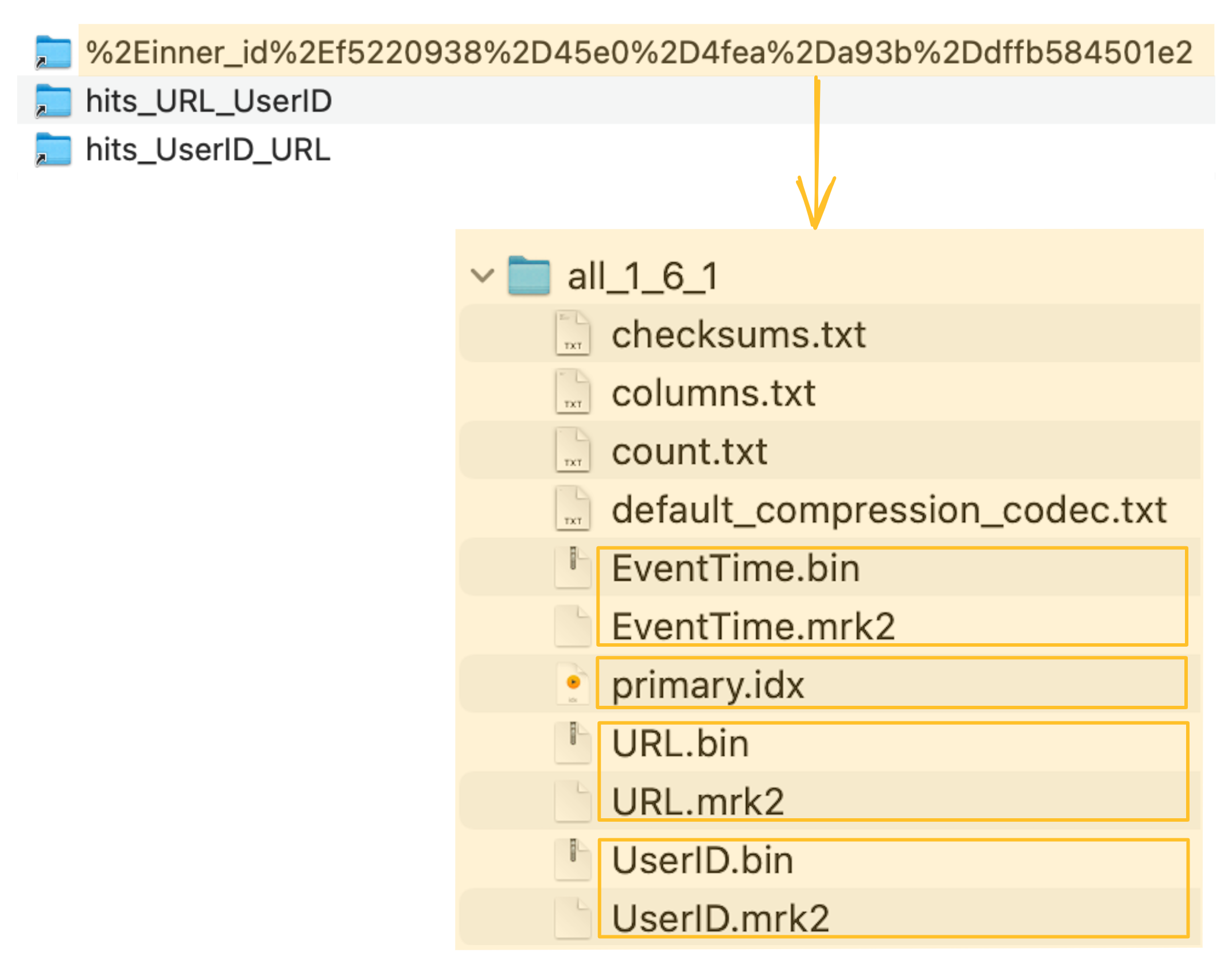 ClickHouse хранит файлы данных колонок (.bin), файлы меток (.mrk2) и первичный индекс (primary.idx) скрытой таблицы в специальной папке (выделенной оранжевым цветом на скриншоте ниже) рядом с файлами данных исходной таблицы, файлами меток и файлами первичных индексов: