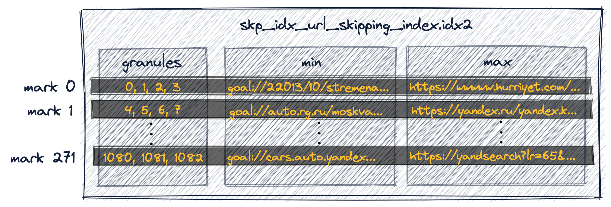 В общей сложности индекс имеет 1083 записи для нашей таблицы с 8.87 миллиона строк и 1083 гранулами:
