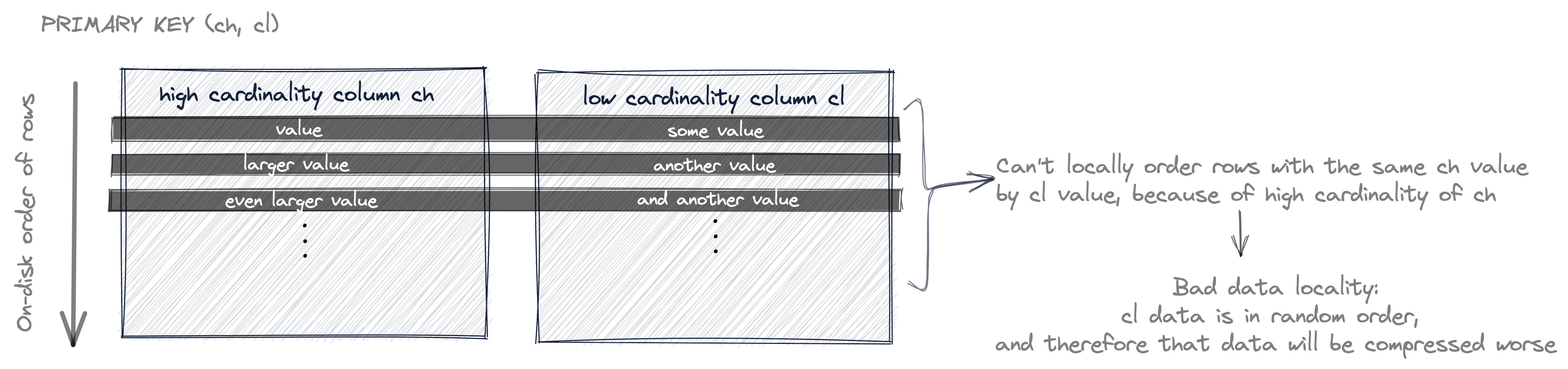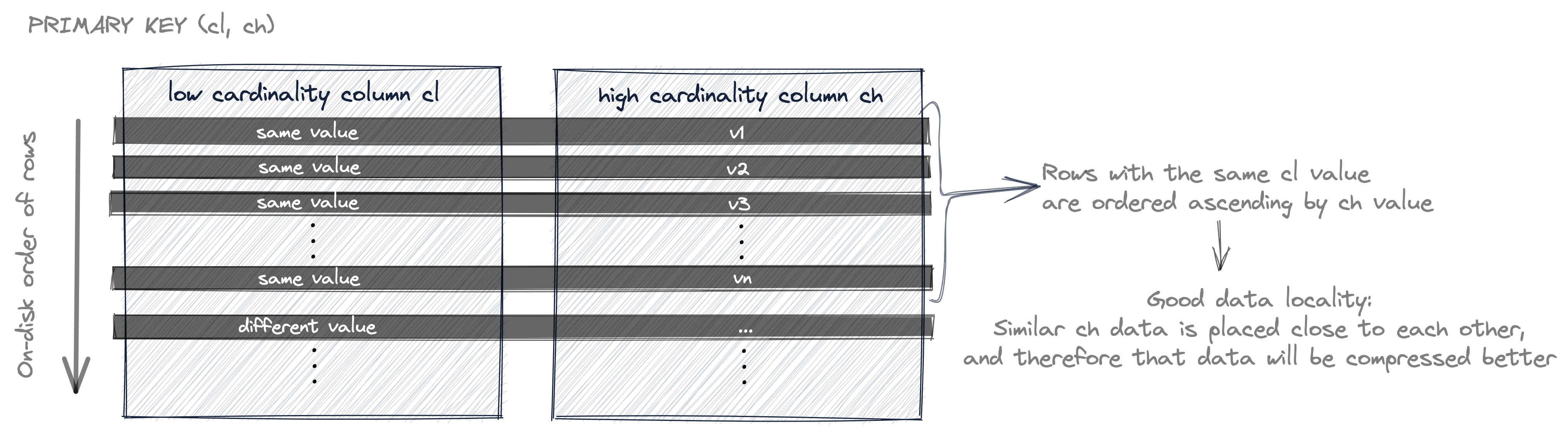 На диаграмме выше строки таблицы (их значения колонок на диске) сначала упорядочены по их значению cl, а строки с одинаковым значением cl упорядочены по значению ch. И поскольку первая ключевая колонка cl имеет низкую кардинальность, вероятнее всего, что существуют строки с одинаковым значением cl. Поэтому также вероятно, что значения ch упорядочены (локально - для строк с одинаковым значением cl).
