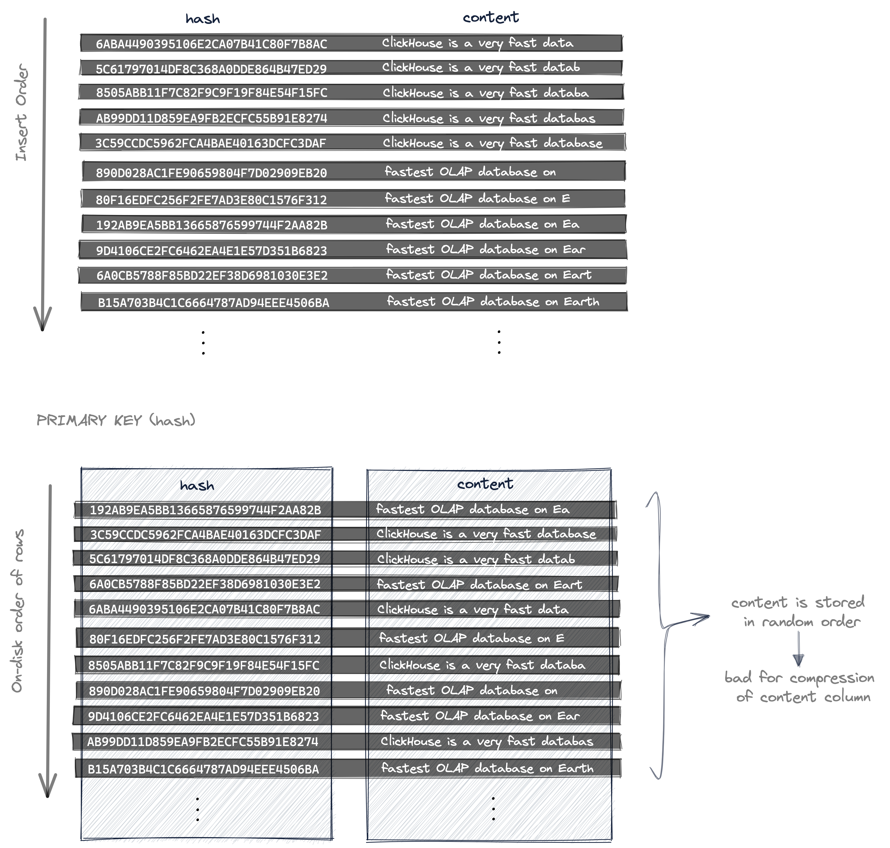 - строки таблицы (их данные колонок) хранятся на диске в порядке, возрастающем по (уникальным и случайным) значениям хеша. Поэтому также значения колонки содержимого хранятся в случайном порядке без локальности данных, что приводит к неоптимальному соотношению сжатия для файла данных колонки содержимого.